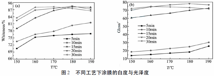 随着固化温度从150℃升到190℃,成膜时间为5min、10min、15 min的白度曲线呈现增长;而成膜时间为20min、30min的白度曲线呈现先增长后降低。其中固化温度为180℃、成膜时间为20min的涂膜白度最高为88.5。