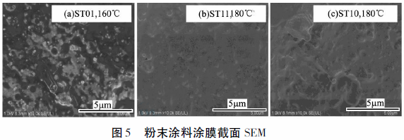 由图5可以看出,在不同成膜条件下,涂膜中形貌情况不同。样品ST01在160℃、20min的成膜条件下,部分粉体颗粒未完全熔融,且钛白粉粉体在涂膜中分布不均匀(图5a);