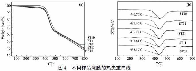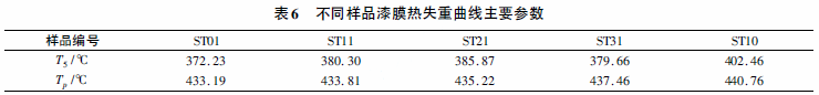 图4为不同样品漆膜的热失重曲线。最大失重速度点的温度用Tp表示;失重5%的温度用T5表示。