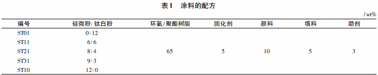 为了确定较佳的硅微粉替代量,将5种不同配比的硅微粉和钛白粉复合粉体(0:1、1:1、2:1、3:1、1:0)添加到粉末涂料中,分别对相应粉末涂料涂膜的性能进行了测试。