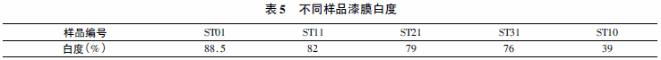 白度表示物质表面白色的程度,用白色含有量的百分率表示。表5为不同样品漆膜白度,图3为不同样品实物图。
