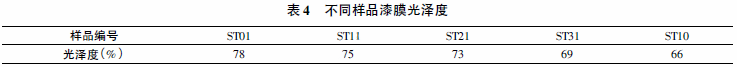 光泽度取决于物体表面对光的镜面反射能力,与颜色无关。表4为不同样品漆膜光泽度。