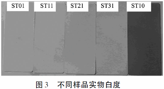 从表5可以看出粉末涂料涂膜的白度随着硅微粉含量增加,先缓慢降低,而后大幅度下降。相应实物图3也能看出白度的降低,尤其样品ST10涂膜已呈现灰色。