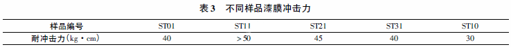 不同样品漆膜抗冲击力结果如表3所示。