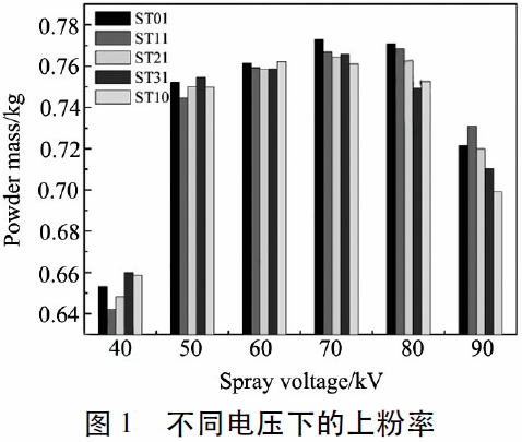 样品ST01、ST11、ST21、ST31、ST10随着喷涂电压的增大,涂料的上粉率变化趋势相近即先上升再下降。因此,喷涂电压设定为70kV较适宜。