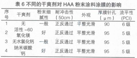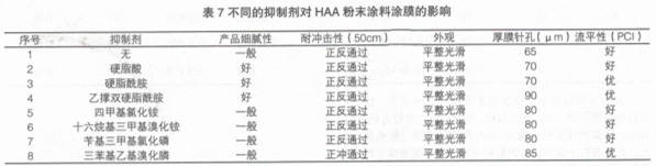 从表6可以看出,上述几种干爽剂的使用,对HAA产品的粉末针孔有适当改善,但流平有降低的趋势,说明这些干爽剂的使用能够减少HAA粉末体系中小分子的散发,可以适当提高厚膜针孔的厚度,但降低了流平性。