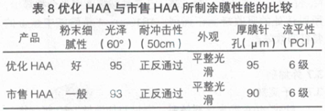 从表8可知,优化后的HAA产品的制板效果与市售HAA在主要性能方面几乎相同,但粉末细腻性、光泽、厚膜针孔厚度及流平性等方面更胜一筹,说明优化的HAA产品可以替代市售HAA产品或与其混合使用。
