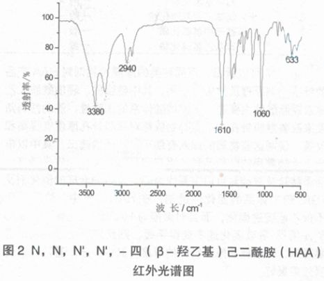 图2是试验产品N,N,N1, N1,-四(β—羟乙基)己二酰胺的红外光谱图,从中可以看出,3380cm-1和3427cm-1分别是酰胺和羟基的特征吸收峰;
